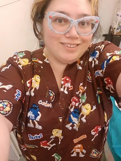 Rocking the unique print scrubs where she works at the Correctional Facility.